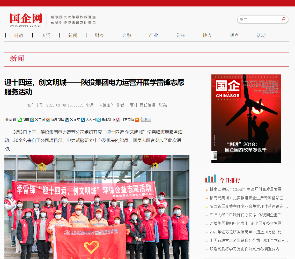 3月3日上午,陜投集團電力運營公司組織開展“迎十四運 創(chuàng)文明城”學雷鋒志愿服務活動,30余名來自于公司項目部、電力試驗研究中心及機關的黨員、團員志愿者參加了此次活動。