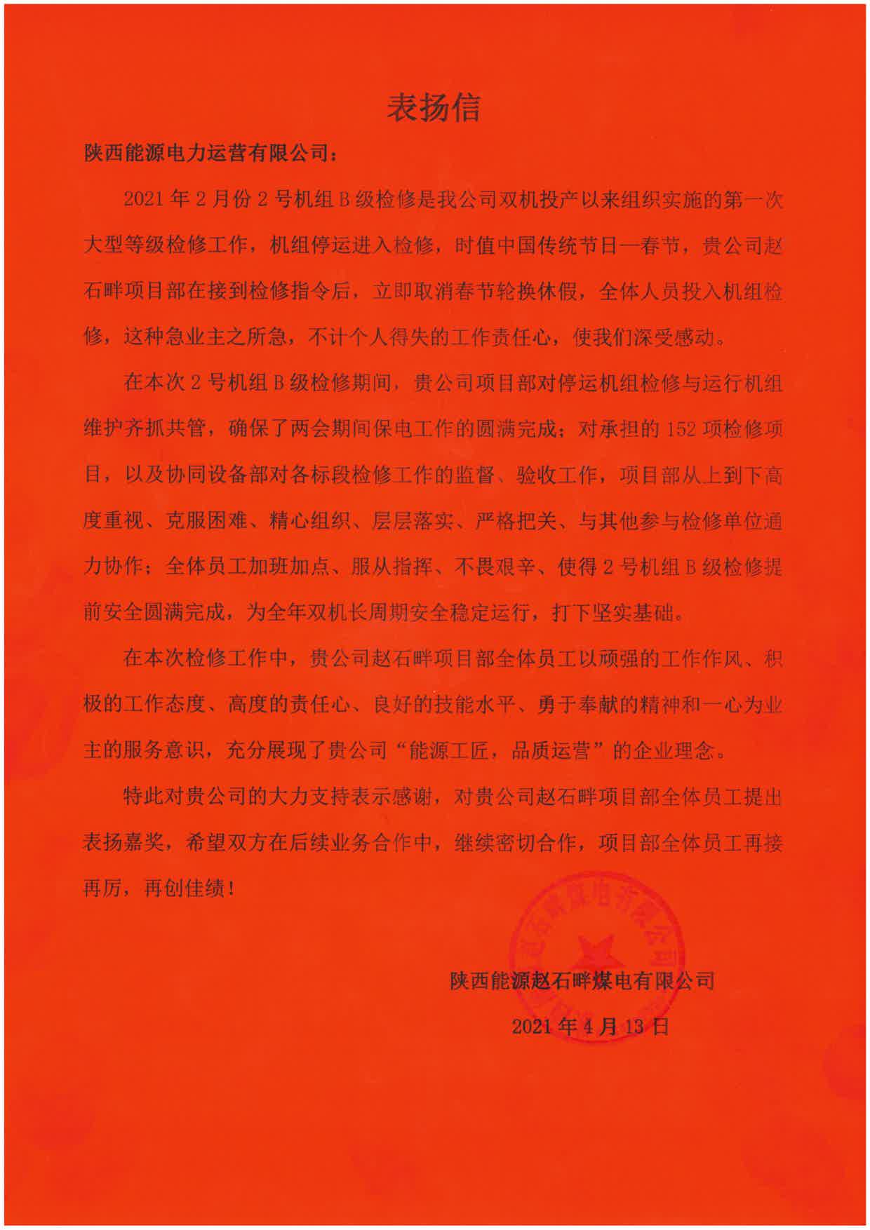 4月14日,公司收到陜西能源趙石畔煤電有限公司的表揚(yáng)信,對趙石畔項目部在2月份雙機(jī)投產(chǎn)后的第一次大型等級檢修和“兩會”保電工作中的付出表示高度贊揚(yáng)。