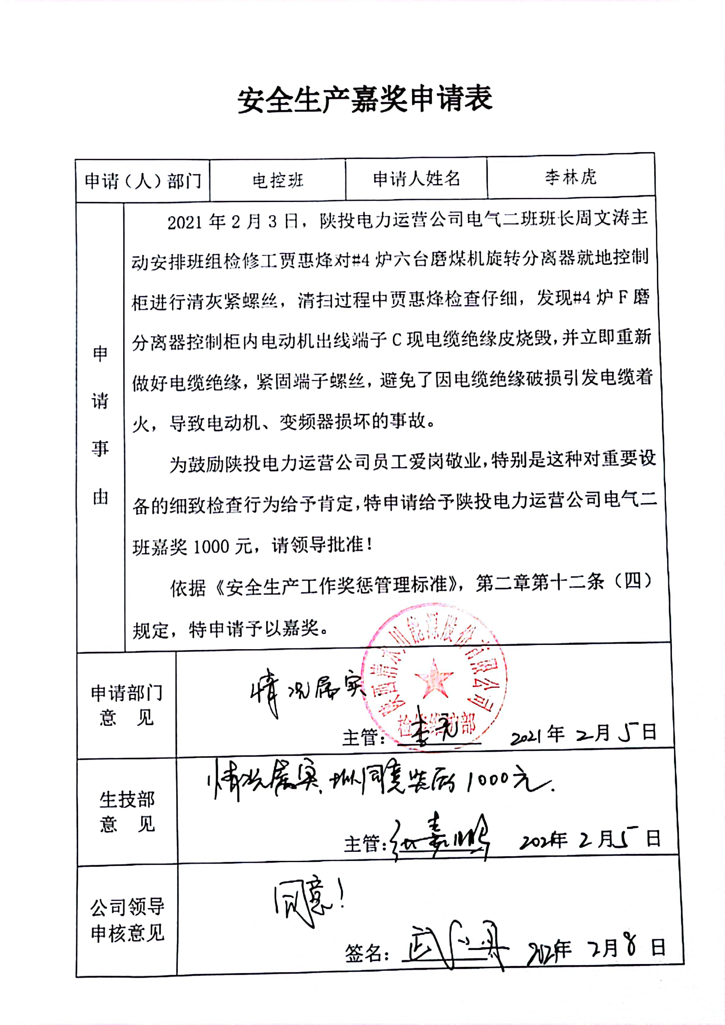 2021年2月1日,清水川#4機組臨停搶修,電氣二班在完成缺陷消除和點檢安排的工作外,主動出擊,對磨煤機分離器控制柜、空預器漏風系統(tǒng)控制柜、除塵PC段開關柜等進行清掃檢查,并發(fā)現(xiàn)#4爐F磨煤機分離器控制柜內(nèi)電動機出線端子C相電纜絕緣皮燒毀的缺陷。班組立即做出相應措施,重新做好電纜絕緣,并緊固端子,避免了因電纜絕緣破損引發(fā)電纜著火,導致電動機、變頻器燒毀的危險,得到了業(yè)主方的認可和贊揚。