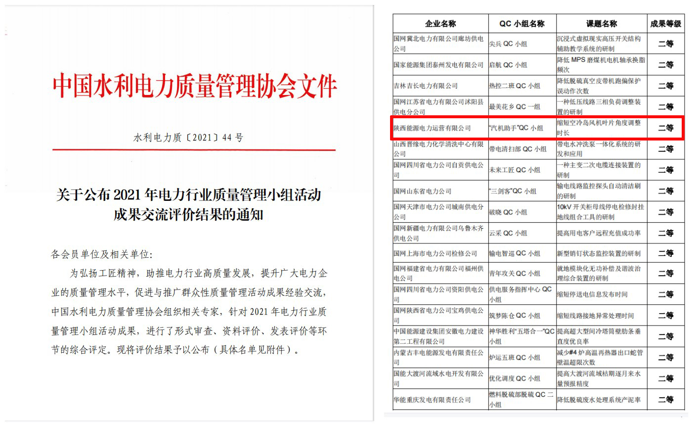 日前,中國(guó)水利電力質(zhì)量管理協(xié)會(huì)公布了2021 年電力行業(yè)質(zhì)量管理小組活動(dòng)成果獲獎(jiǎng)名單,公司QC成果從來(lái)自全國(guó)電力行業(yè)各單位的1129項(xiàng)優(yōu)秀成果中脫穎而出,斬獲二等獎(jiǎng)。該成果先后獲得2020年度陜西省電力行業(yè)協(xié)會(huì)質(zhì)量管理小組活動(dòng)一等獎(jiǎng)、“秦創(chuàng)原·涇河新城杯”2021年陜西省創(chuàng)新方法大賽三等獎(jiǎng)等。依托該成果研制的“一種空冷島風(fēng)機(jī)葉片角度測(cè)量專用工具”已取得國(guó)家實(shí)用新型專利授權(quán)。
