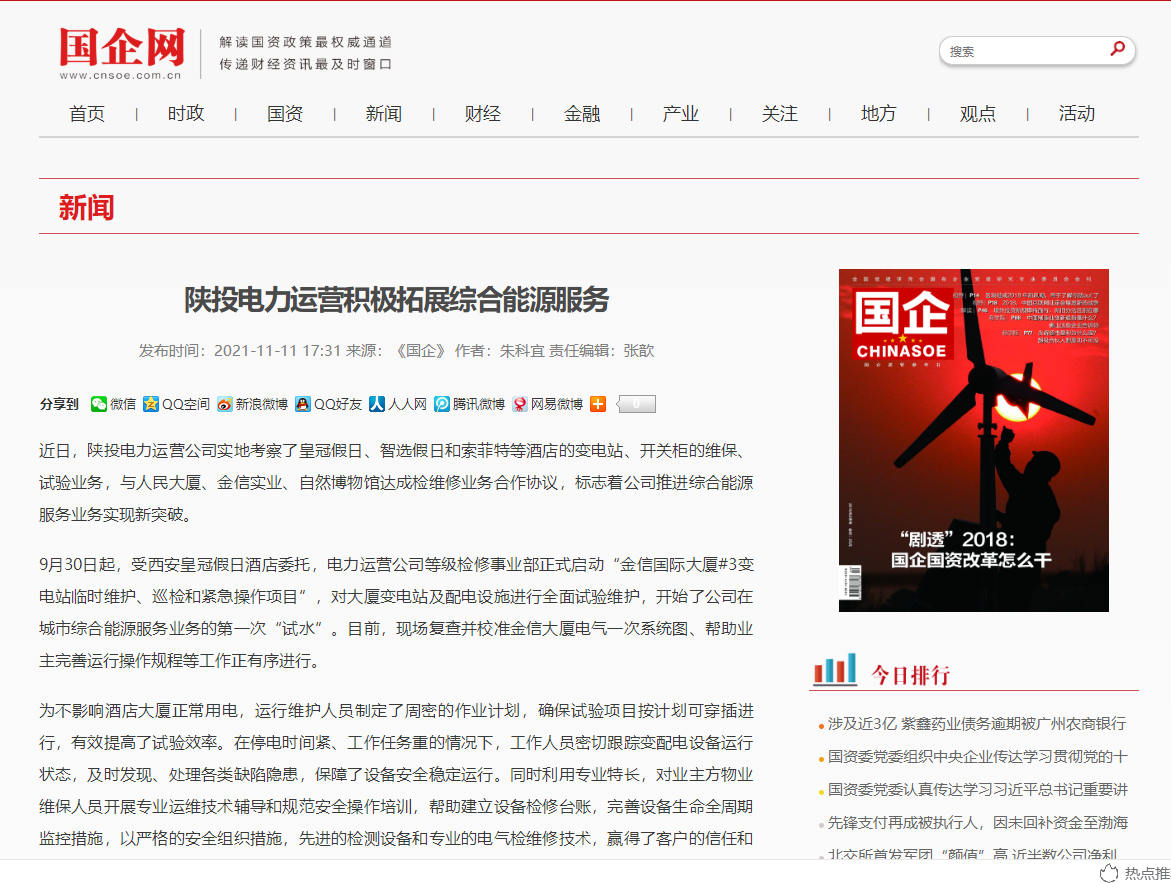 近日,公司實地考察了皇冠假日、智選假日和索菲特等酒店的變電站、開關(guān)柜的維保、試驗業(yè)務(wù),與人民大廈、金信實業(yè)、自然博物館達(dá)成檢維修業(yè)務(wù)合作協(xié)議,標(biāo)志著公司推進(jìn)綜合能源服務(wù)業(yè)務(wù)實現(xiàn)新突破。