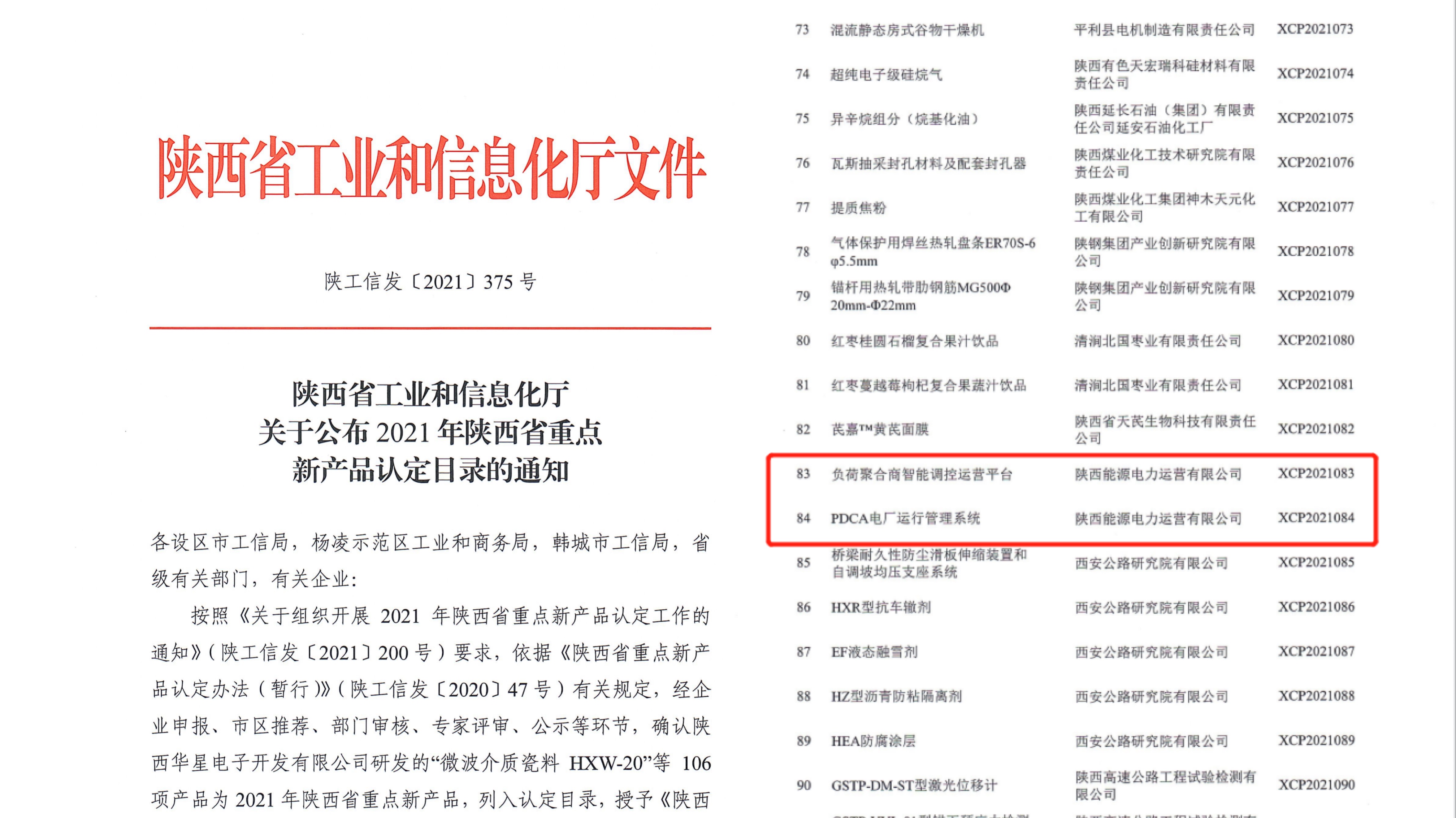 日前,陜西省工信廳公布了2021年陜西省重點新產(chǎn)品認定目錄,公司《負荷聚合商智能調(diào)控運營平臺》和《PDCA電廠運行管理系統(tǒng)》項目被列入陜西省重點新產(chǎn)品目錄,并獲取認定證書。入選項目經(jīng)過前期的軟件開發(fā)、科技查新、專家評審、科技成果認定等環(huán)節(jié)層層篩選,經(jīng)專家組認定,達到了所在領(lǐng)域的國內(nèi)領(lǐng)先水平。