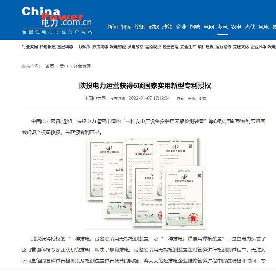 近期,陜投電力運營申請的“一種發(fā)電廠設備安裝用無損檢測裝置”等6項實用新型專利獲得國家知識產權局授權,并獲頒專利證書。