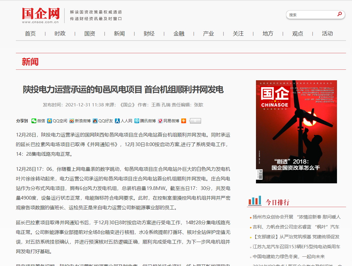 近日,公司承運(yùn)的國(guó)網(wǎng)陜西旬邑風(fēng)電項(xiàng)目莊合風(fēng)電站、延長(zhǎng)巴拉素風(fēng)電首臺(tái)機(jī)組相繼并網(wǎng)發(fā)電。這是電力運(yùn)營(yíng)承接的首臺(tái)和第二臺(tái)風(fēng)電項(xiàng)目,為公司深耕風(fēng)力發(fā)電領(lǐng)域提供了經(jīng)驗(yàn)和技術(shù)儲(chǔ)備。