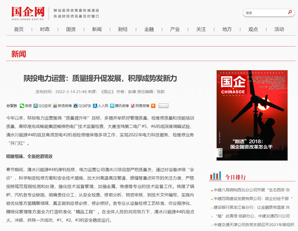 今年以來,電力運營公司圍繞“質(zhì)量提升年”目標,多措并舉抓好管理質(zhì)量、檢維修質(zhì)量和技能培訓質(zhì)量,高標準完成榆能集團榆神熱電廠技術(shù)監(jiān)督檢查、大唐寶雞第二電廠#5、#6機組深度調(diào)峰試驗、清水川能源#4機組及商洛發(fā)電#2機組檢修維保等多項工作,實現(xiàn)2022年電力科技服務(wù)、檢維修業(yè)務(wù)“開門紅”。