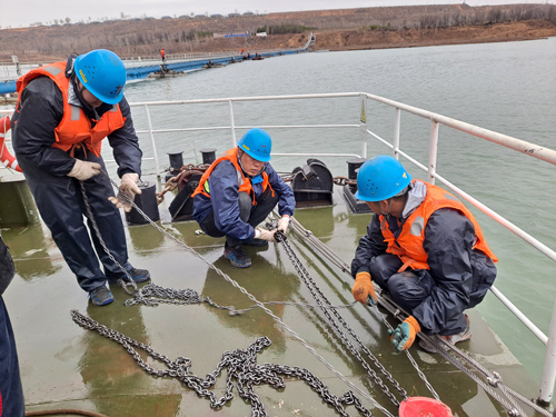 在這樣惡劣的自然環(huán)境下,大家沒有一句怨言,只有一個信念,就是盡快將水源線恢復正常,保障業(yè)主方機組安全穩(wěn)定運行。憑著運營人的沖勁和強烈的責任感,配合業(yè)主方順利完成3號浮箱起吊、取水管線調平的搶修任務,圓滿完成此次水源地泵船取水管線搶修工作。