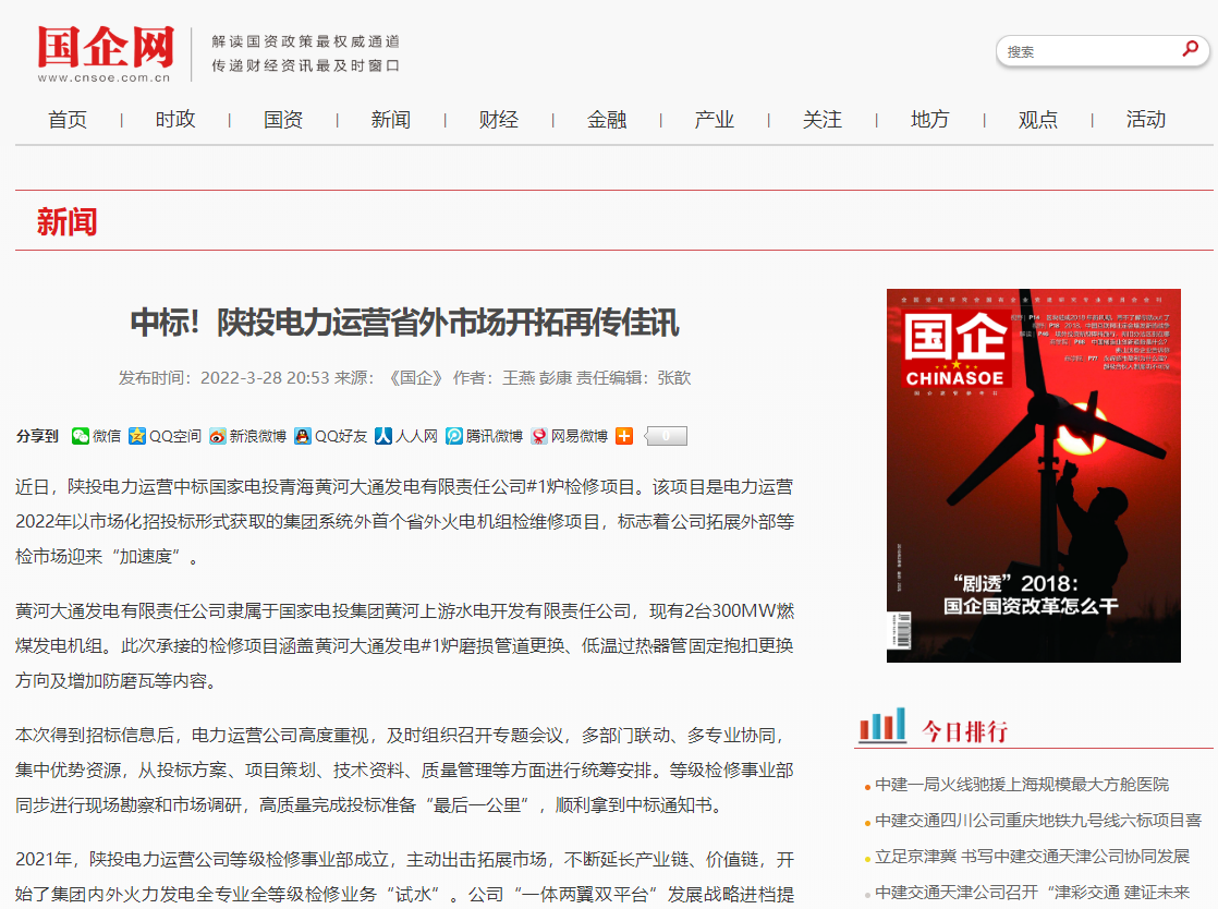 近日,陜西能源電力運營有限公司中標國家電投青海黃河大通發(fā)電有限責任公司#1爐檢修項目。該項目是電力運營2022年以市場化招投標形式獲取的集團系統(tǒng)外首個省外火電機組檢維修項目,標志著公司拓展外部等檢市場迎來“加速度”。