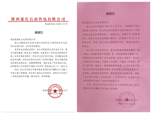 6月14日,陜煤新元潔能、延長售電先后發(fā)來感謝信,對(duì)公司優(yōu)質(zhì)完成#2機(jī)組A級(jí)檢修、巴拉素分散式風(fēng)電機(jī)組240試運(yùn)和 AGC、AVC 的系統(tǒng)調(diào)試項(xiàng)目表示感謝。