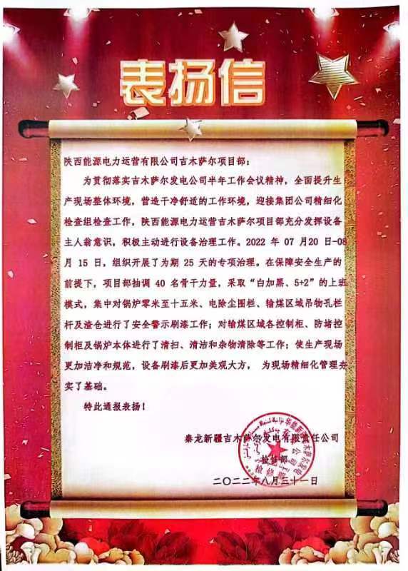 9月1日,公司相繼收到吉木薩爾發(fā)電檢修部、商洛發(fā)電設(shè)備部發(fā)來的表揚信,對吉木薩爾項目部高效優(yōu)質(zhì)完成為期25天的設(shè)備專項治理和商洛項目部鍋爐班加班加點完成搶修表示感謝。