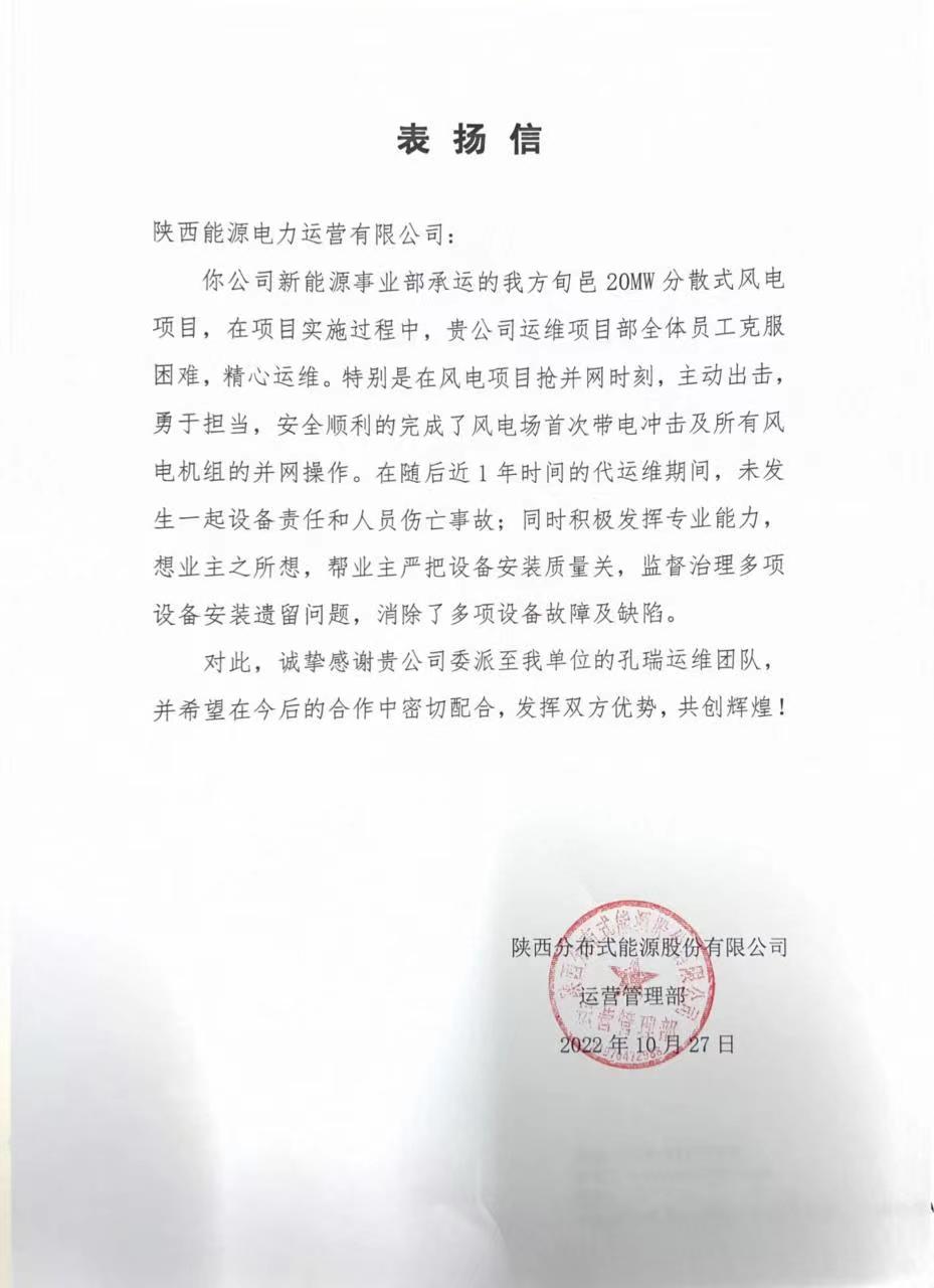 10月27日,公司收到陜西分布式能源公司發(fā)來(lái)的表?yè)P(yáng)信,對(duì)新能源事業(yè)部旬邑風(fēng)電項(xiàng)目部孔瑞運(yùn)維團(tuán)隊(duì)克服困難,精心運(yùn)維,在急難險(xiǎn)重工作中能主動(dòng)出擊、勇于擔(dān)當(dāng)?shù)木癖硎靖叨荣潛P(yáng)。