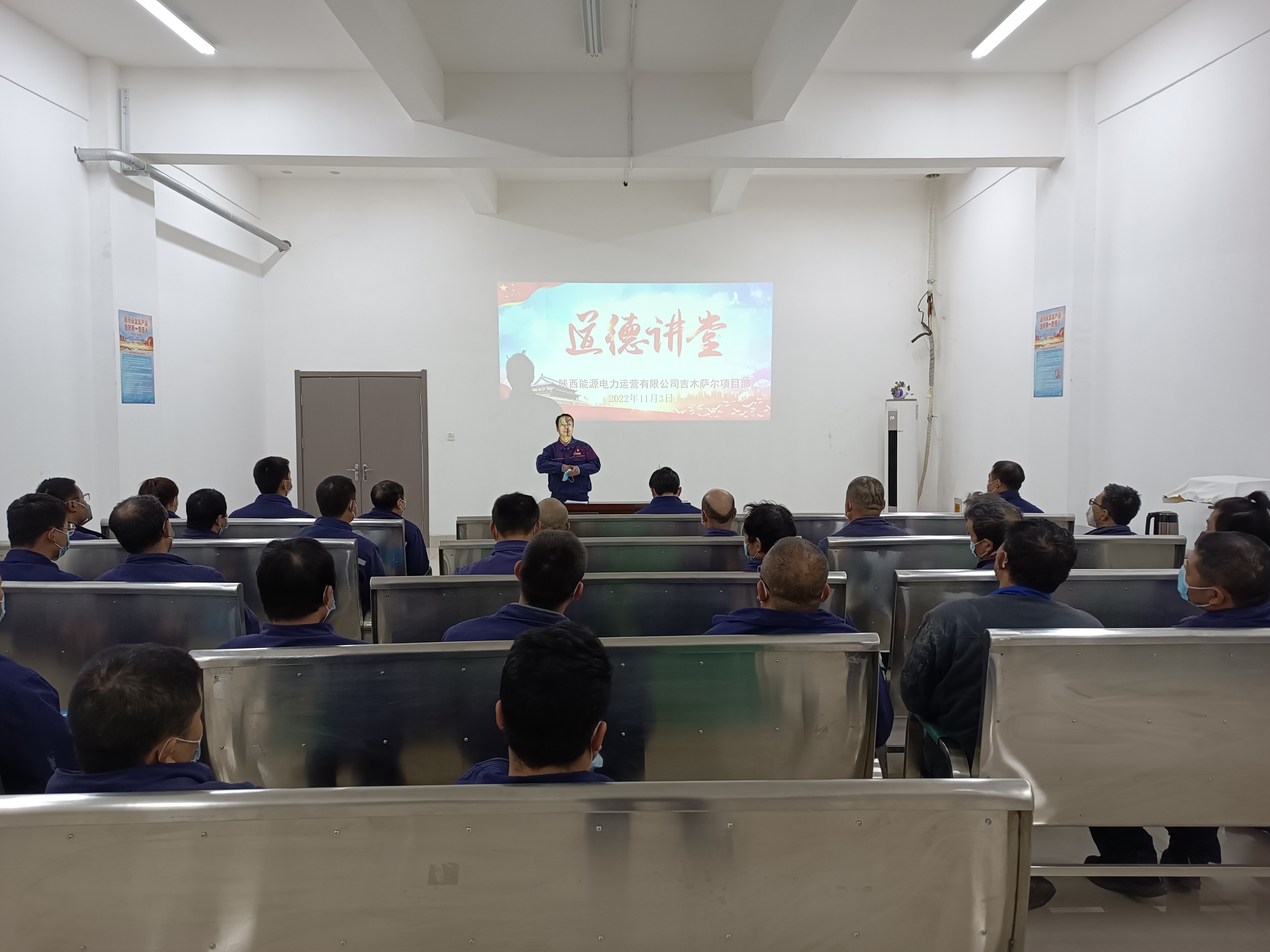11月3日,吉木薩爾項目部開展了“敬業(yè)奉獻”主題道德講堂活動。本次道德講堂共分為自我反省、同唱經(jīng)典、觀看視頻、論語賞析、模范宣講和總結(jié)點評六個環(huán)節(jié)。