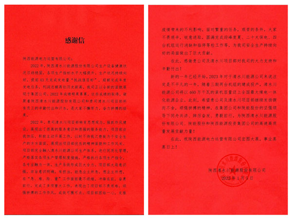 1月7日,清水川能源副總工程師楊朝棟一行給清水川項(xiàng)目部送來感謝信,對項(xiàng)目部急業(yè)主所急,想業(yè)主所想,在急難險(xiǎn)重工作面前毫不退縮、沖鋒在前,圓滿完成迎峰度夏、二十大保電及四臺機(jī)組運(yùn)行消缺和等檢工作等給予了高度認(rèn)可。
