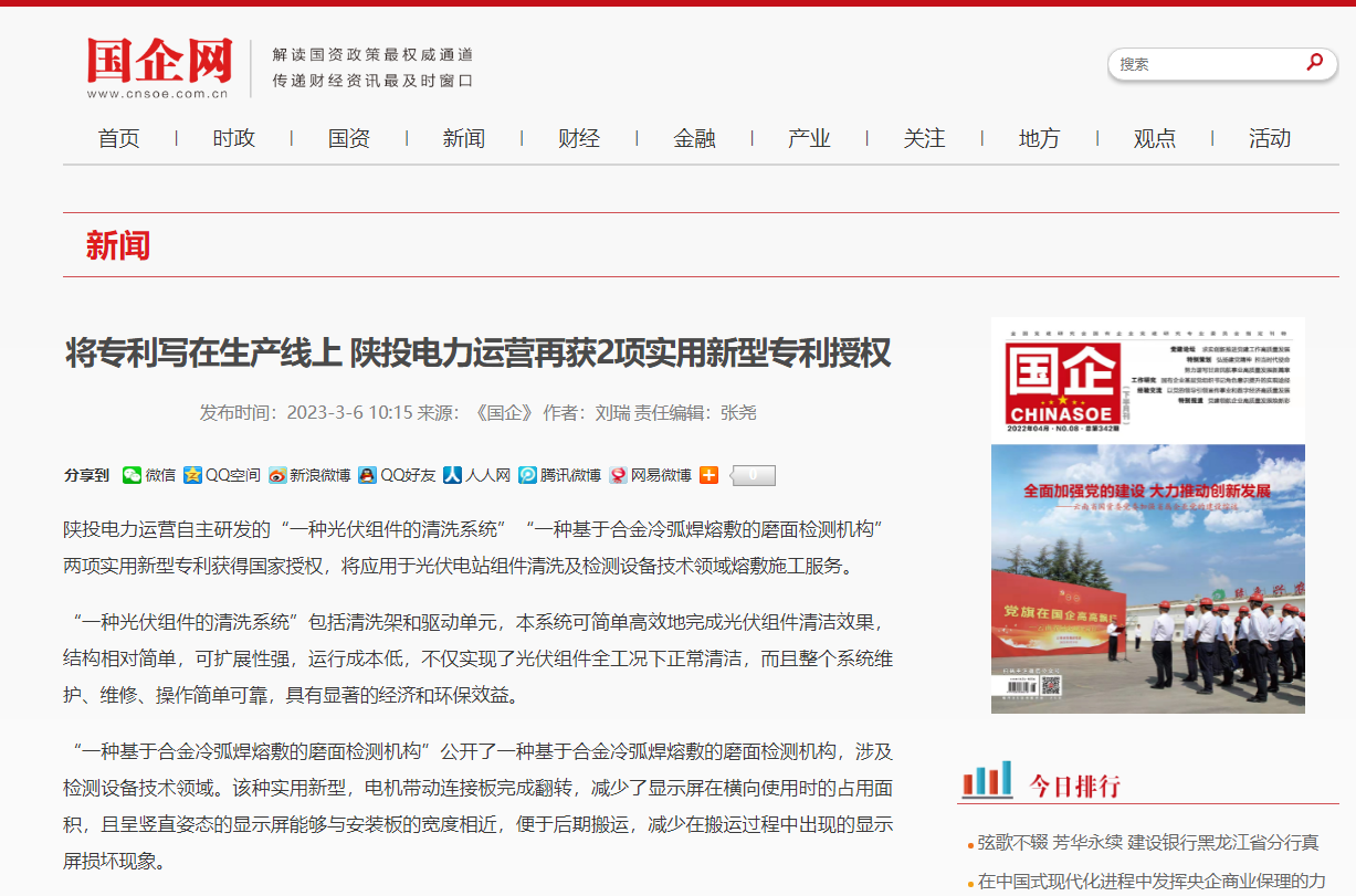 電力運(yùn)營(yíng)自主研發(fā)的“一種光伏組件的清洗系統(tǒng)”“一種基于合金冷弧焊熔敷的磨面檢測(cè)機(jī)構(gòu)”兩項(xiàng)實(shí)用新型專(zhuān)利獲得國(guó)家授權(quán),將應(yīng)用于光伏電站組件清洗及檢測(cè)設(shè)備技術(shù)領(lǐng)域熔敷施工服務(wù)。