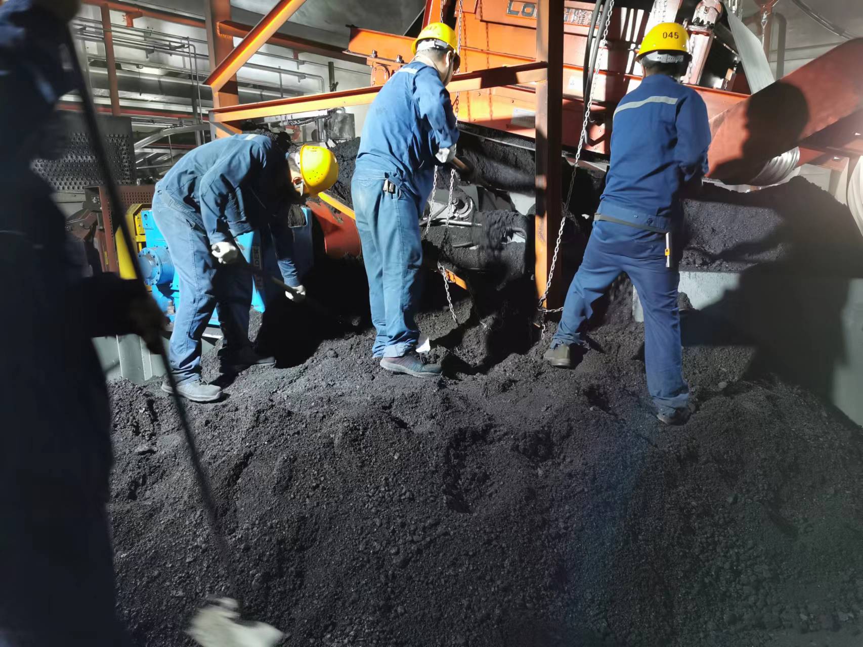 時間緊、任務(wù)急,在積煤最嚴重的#7帶拉緊小室,所有隊員面對堆積如小山的濕煤,齊心協(xié)力、配合默契,揮動著鍬鎬,爭分奪秒裝運積煤。有的積煤雖然沒那么濕,粘性卻很大,一鍬下去根本鏟不動,只能分割成“豆腐塊”逐一處理,最難對付的還是堆積在設(shè)備下部的積煤,大家直不起腰、發(fā)不上力,清理起來極為困難,只能用最原始的方式一鍬一鍬清理。30多度高溫使得運行車間內(nèi)愈加悶熱,不一會兒人人大汗淋漓、手上磨起水泡,汗水浸透工衣,“煤山”也以肉眼可見的速度逐漸變小。經(jīng)過40小時的連續(xù)奮戰(zhàn),輸煤系統(tǒng)恢復(fù)正常運行。