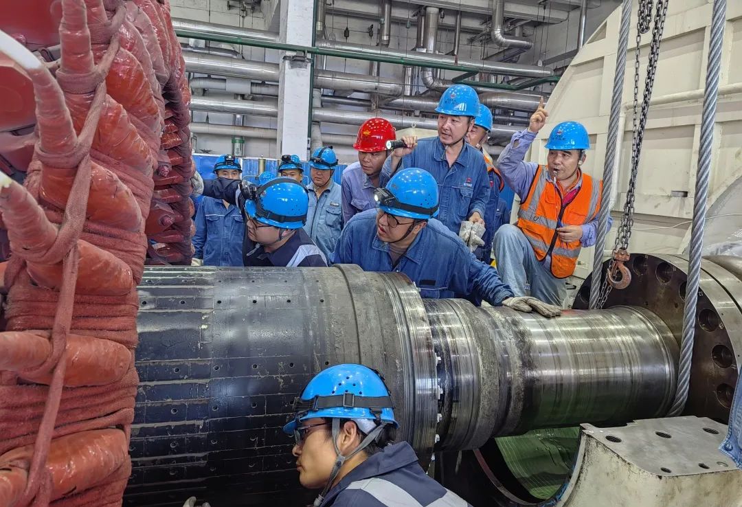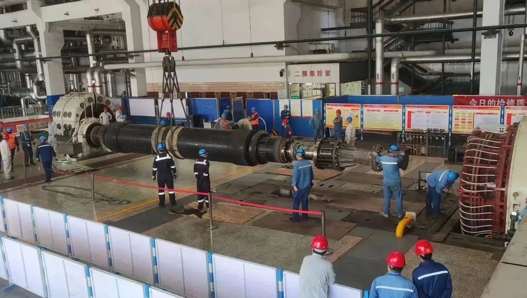 14:00,在起重人員的統(tǒng)一指揮下,發(fā)電機(jī)轉(zhuǎn)子軸頭嶄露。“慢一點(diǎn),保證轉(zhuǎn)子水平,注意監(jiān)視抬軸量”,電氣人員正目不轉(zhuǎn)睛觀測(cè)轉(zhuǎn)子與定子的間隙,起重人員熟練的調(diào)整轉(zhuǎn)子水平度,確保轉(zhuǎn)子全過(guò)程始終處于平穩(wěn)狀態(tài)。經(jīng)過(guò)6個(gè)多小時(shí)的不懈努力,這個(gè)長(zhǎng)14米,重達(dá)64噸的“大家伙”終于全部亮相,標(biāo)志著#4機(jī)C修工作一個(gè)重大工作節(jié)點(diǎn)順利完成,為安全、優(yōu)質(zhì)、高效完成等級(jí)檢修奠定堅(jiān)實(shí)的基礎(chǔ)。