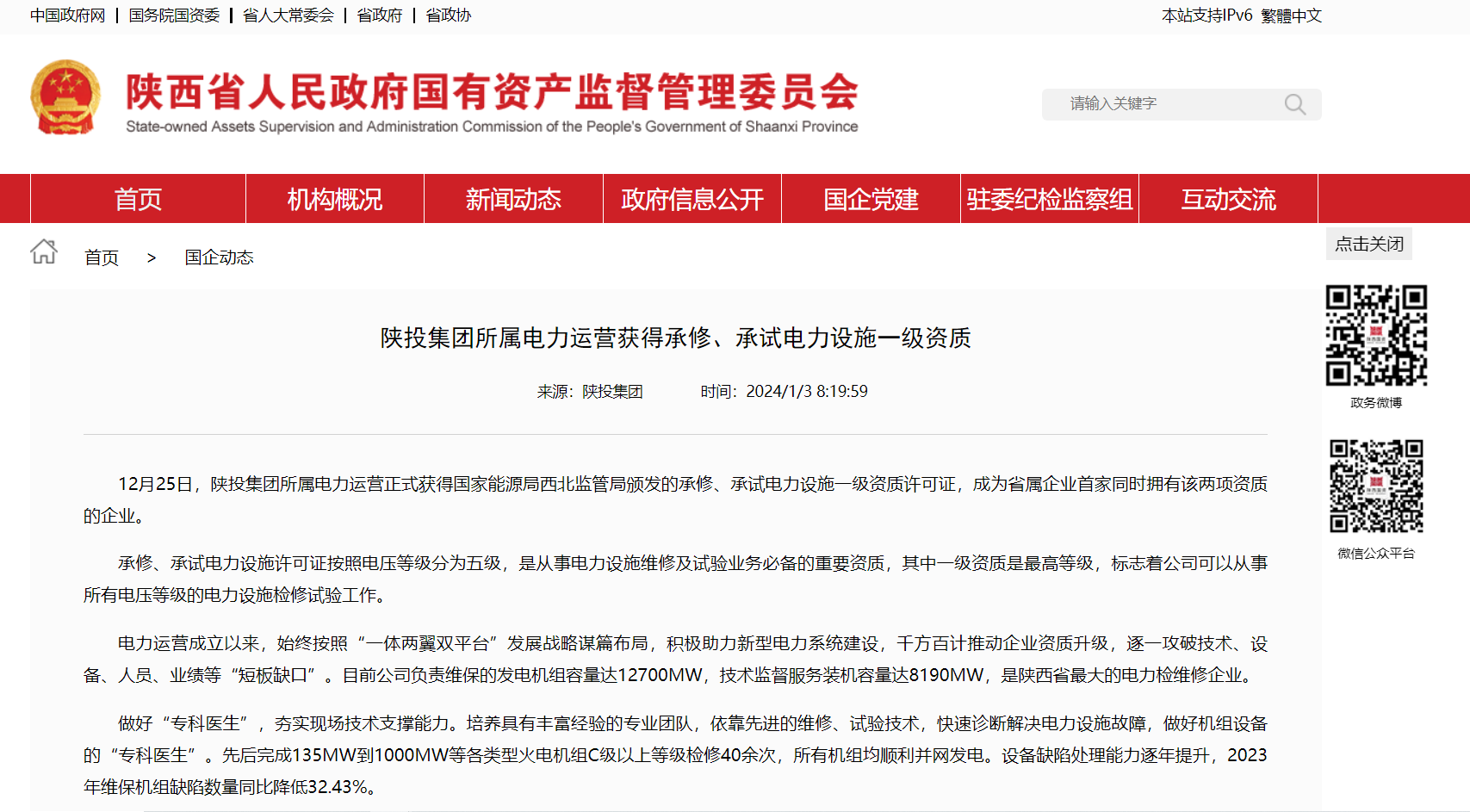 12月25日,陜投集團所屬電力運營正式獲得國家能源局西北監(jiān)管局頒發(fā)的承修、承試電力設(shè)施一級資質(zhì)許可證,成為省屬企業(yè)首家同時擁有該兩項資質(zhì)的企業(yè)。