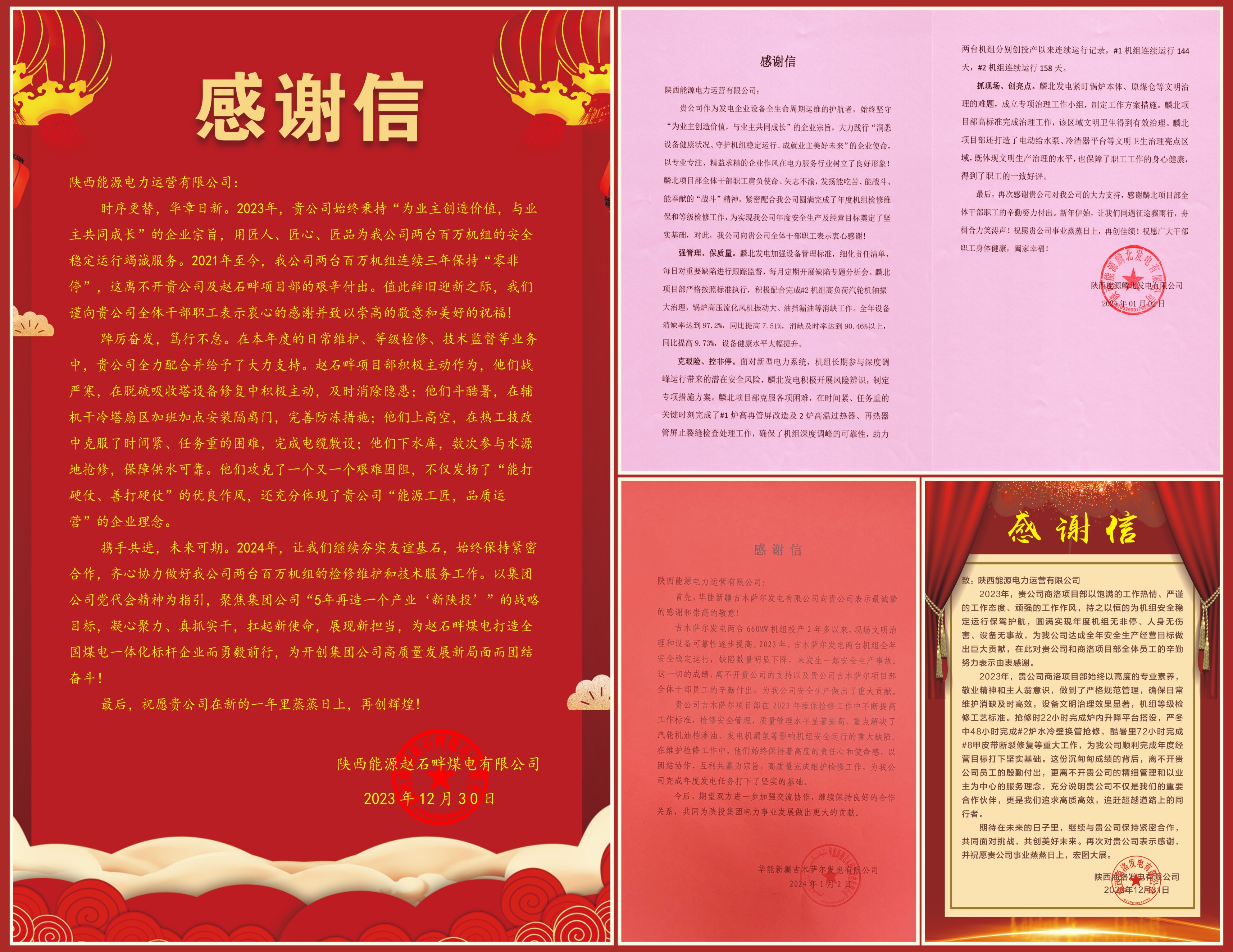 近日,公司連續(xù)收到商洛發(fā)電、麟北發(fā)電、趙石畔煤電、吉木薩爾發(fā)電等多家業(yè)主單位發(fā)來的感謝信,對電力運(yùn)營各項(xiàng)目部在急難險重工作面前毫不退縮、沖鋒在前,圓滿完成機(jī)組運(yùn)維檢修任務(wù)給予高度肯定和贊揚(yáng)。