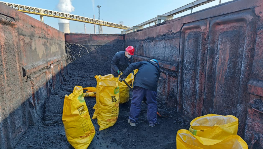 搶卸現(xiàn)場,鐵锨、洋鎬和凍煤的撞擊的“交響樂”此起彼伏,“注意安全!”的提醒聲不絕于耳。零下10多度的室外,寒風(fēng)一陣緊過一陣,隊員互相配合,干得熱火朝天,一刻不停地進行著清理工作……大量凍煤從車廂壁、車廂角、車廂底清理下來,一點不漏地落入卸煤溝。短短四天內(nèi),工作人員卸煤3000多袋近120噸,圓滿完成凍煤接卸“攻堅戰(zhàn)”,讓每一粒珍貴的鍋爐“口糧”顆粒歸倉。