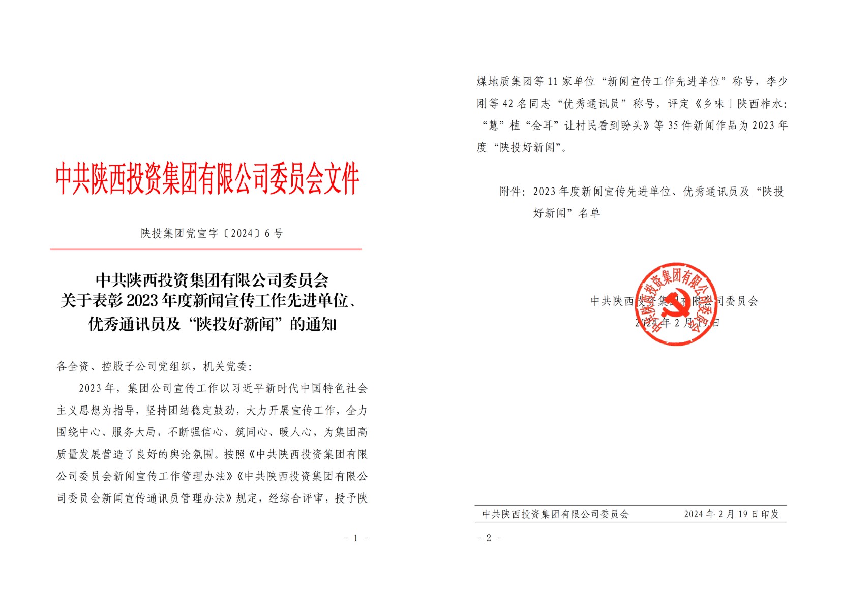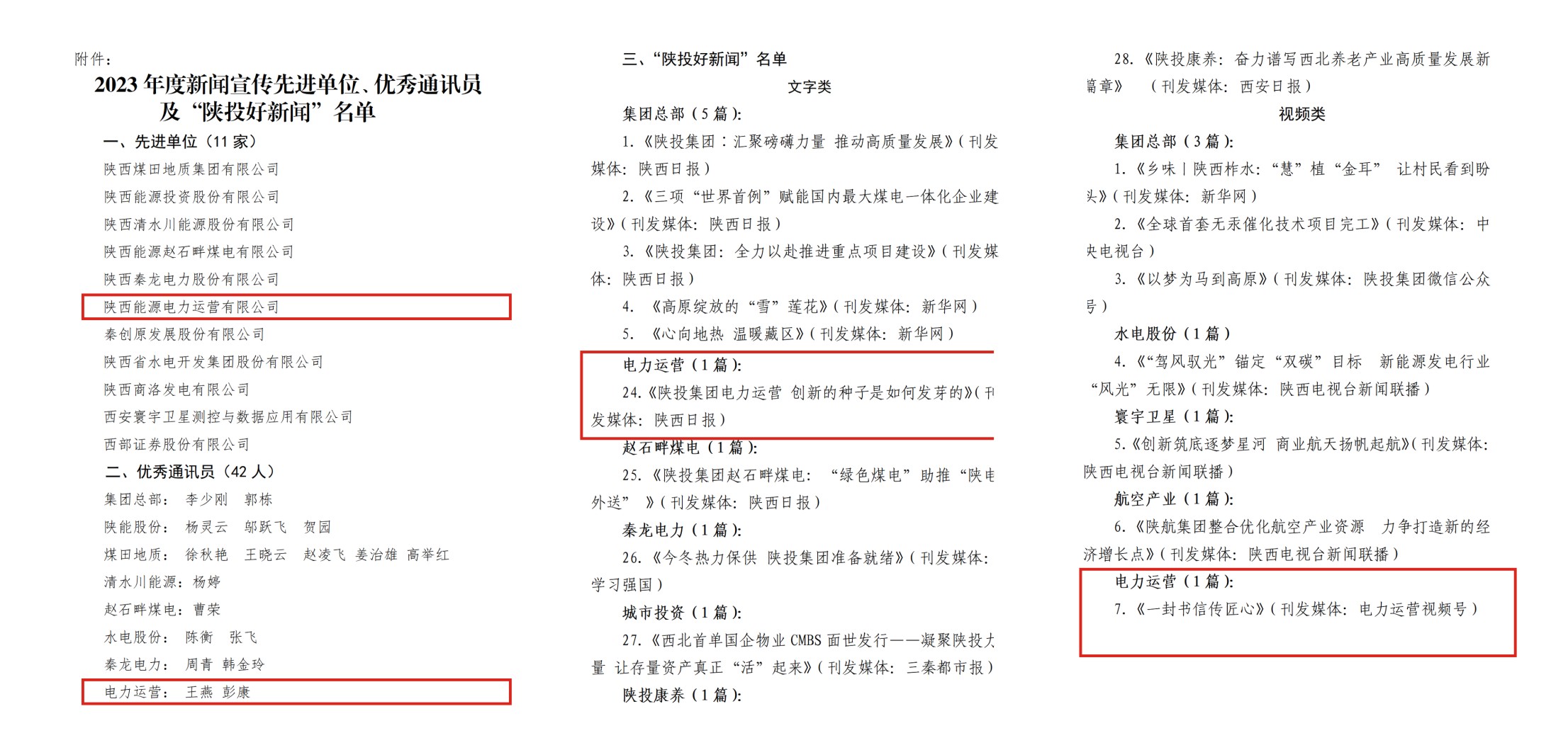 近日,公司榮獲集團(tuán)公司2023年度“新聞宣傳工作先進(jìn)單位”稱號(hào),連續(xù)五年獲此殊榮。公司拍攝的視頻《一封書(shū)信傳匠心》、稿件《陜投集團(tuán)電力運(yùn)營(yíng) 創(chuàng)新的種子是如何發(fā)芽的》分獲“陜投好新聞”。
