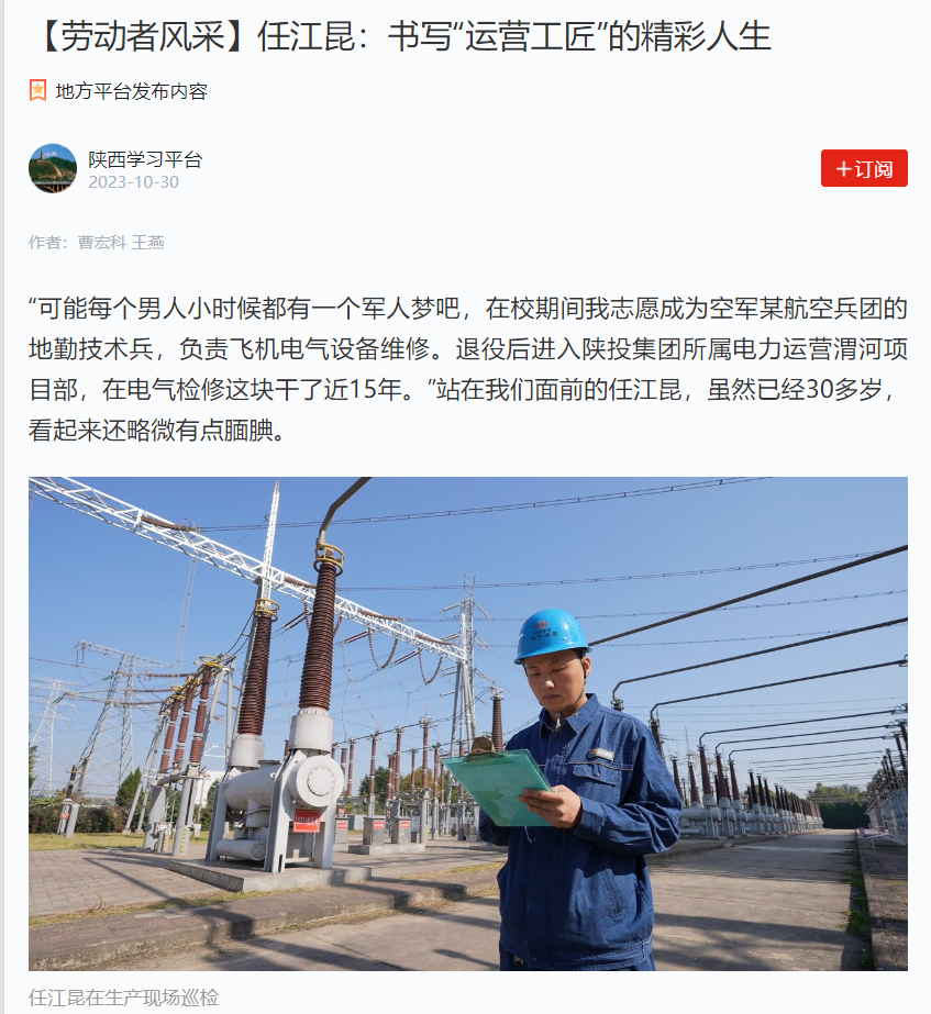 “可能每個(gè)男人小時(shí)候都有一個(gè)軍人夢(mèng)吧,在校期間我志愿成為空軍某航空兵團(tuán)的地勤技術(shù)兵,負(fù)責(zé)飛機(jī)電氣設(shè)備維修。退役后進(jìn)入電力運(yùn)營(yíng)渭河項(xiàng)目部,在電氣檢修這塊干了近15年。”站在我們面前的任江昆,雖然已經(jīng)30多歲,看起來(lái)還略微有點(diǎn)靦腆。