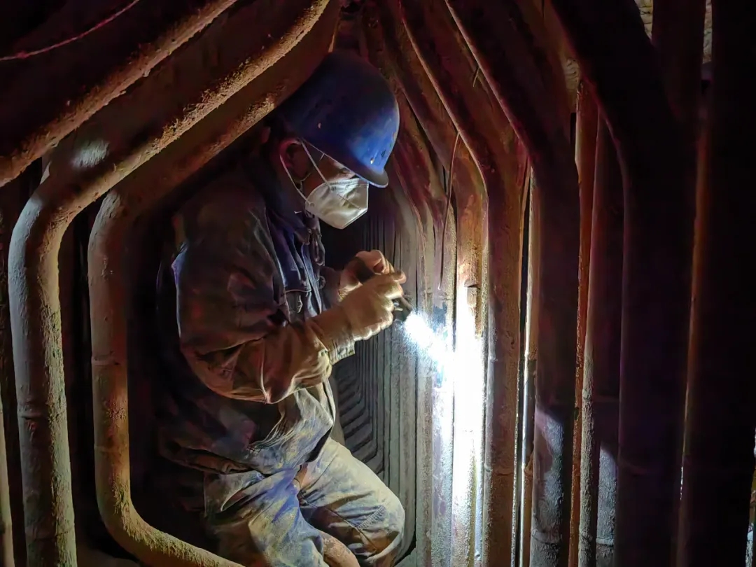 汽包壁溫和鍋爐大罩殼溫度元件是監(jiān)視超溫、泄漏的重要設(shè)備,關(guān)乎機組安全穩(wěn)定運行。由于溫度元件處在鍋爐大罩殼與機箱管排之間,周邊管排布置復(fù)雜、保溫材料多,武朝輝只能帶著同事鉆進狹小的空間內(nèi)進行操作。“這地方又悶又熱,空間又小,一下子要更換106個‘鍋爐體溫計’,黨員不上誰上!”武朝輝擦著汗,樂呵呵地說道。