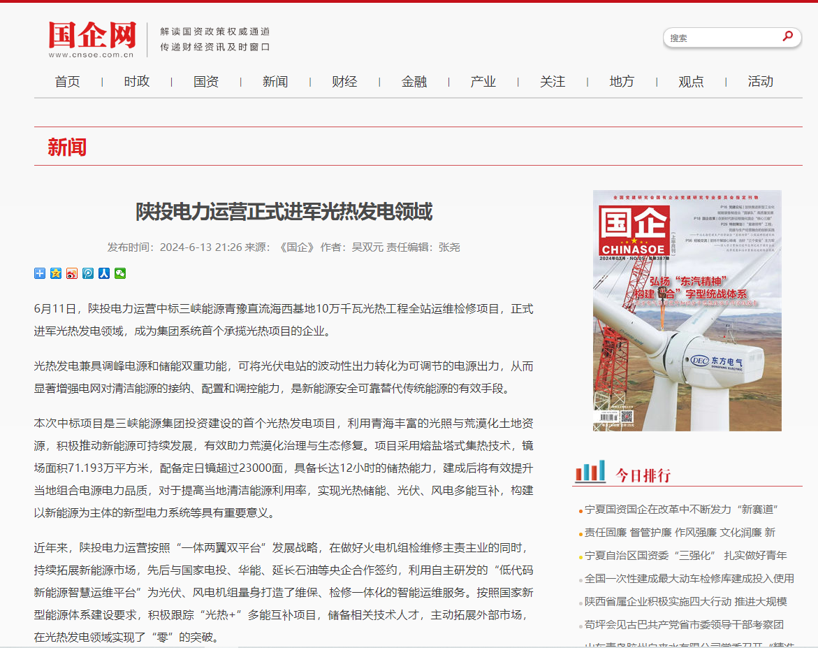 6月11日,電力運營中標(biāo)三峽能源青豫直流海西基地10萬千瓦光熱工程全站運維檢修項目,正式進(jìn)軍光熱發(fā)電領(lǐng)域,也是陜投集團(tuán)首個承攬光熱項目業(yè)務(wù)的企業(yè)。