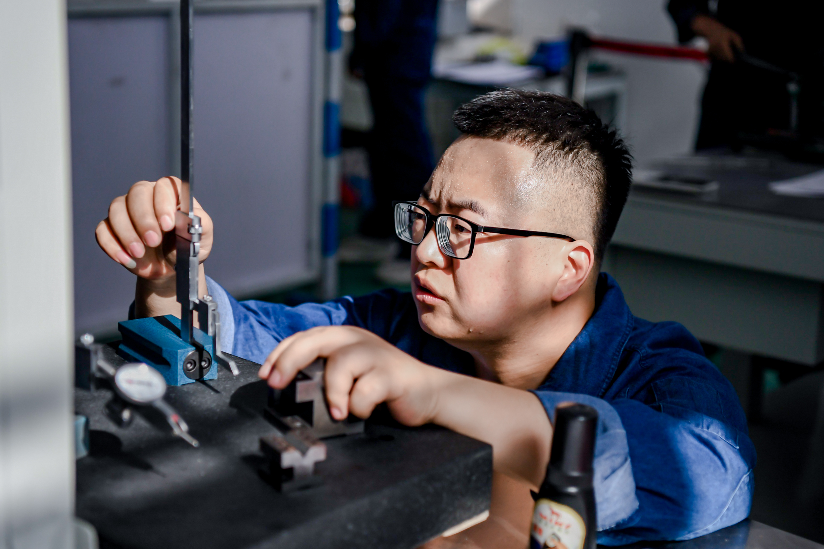 鉗工實(shí)操賽場(chǎng),參賽選手或銼削或鉆孔或攻螺紋,一板一眼、得心應(yīng)手。他們要在5個(gè)小時(shí)內(nèi)按照?qǐng)D紙要求制作工件,將工件打磨、研修、修整后達(dá)到精度要求。“鉗工是所有加工技術(shù)的基礎(chǔ),包含10多道工藝,所以有著‘萬(wàn)能工種’的說(shuō)法,要求精度達(dá)到0.02毫米,差不多是一根頭發(fā)絲的三分之一。”現(xiàn)場(chǎng)裁判劉方明感慨地說(shuō)。