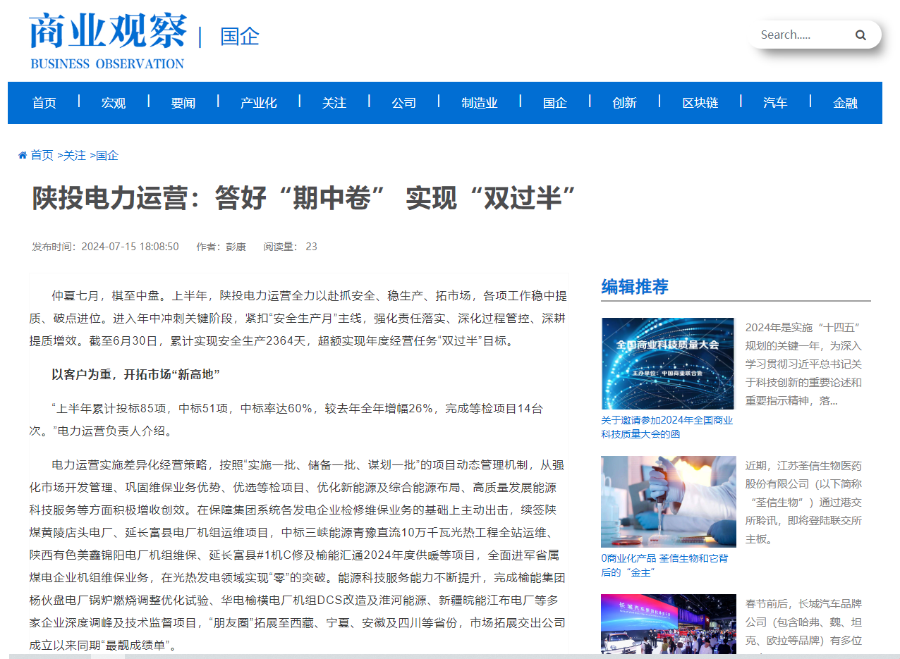 “上半年累計投標85項,中標51項,中標率達60%,較去年全年增幅26%,完成等檢項目14臺次。”電力運營負責人介紹。電力運營實施差異化經(jīng)營策略,按照“實施一批、儲備一批、謀劃一批”的項目動態(tài)管理機制,從強化市場開發(fā)管理、鞏固維保業(yè)務優(yōu)勢、優(yōu)選等檢項目、優(yōu)化新能源及綜合能源布局、高質(zhì)量發(fā)展能源科技服務等方面積極增收創(chuàng)效。在保障集團系統(tǒng)各發(fā)電企業(yè)檢修維保業(yè)務的基礎上主動出擊,續(xù)簽陜煤黃陵店頭電廠、延長富縣電廠機組運維項目,中標三峽能源青豫直流10萬千瓦光熱工程全站運維、陜西有色美鑫錦陽電廠機組維保、延長富縣#1機C修及榆能匯通2024年度供暖等項目,全面進軍省屬煤電企業(yè)機組維保業(yè)務,在光熱發(fā)電領(lǐng)域?qū)崿F(xiàn)“零”的突破。能源科技服務能力不斷提升,完成榆能集團楊伙盤電廠鍋爐燃燒調(diào)整優(yōu)化試驗、華電榆橫電廠機組DCS改造及淮河能源、新疆皖能江布電廠等多家企業(yè)深度調(diào)峰及技術(shù)監(jiān)督項目,“朋友圈”拓展至西藏、寧夏、安徽及四川等省份,市場拓展交出公司成立以來同期“最靚成績單”。