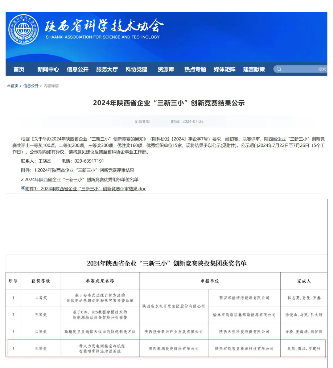 日前,君創(chuàng)科技 “一種火力發(fā)電間接空冷機(jī)組智能噴霧降溫增濕系統(tǒng)”榮獲2024年陜西省企業(yè)“三新三小”創(chuàng)新競(jìng)賽三等獎(jiǎng)。