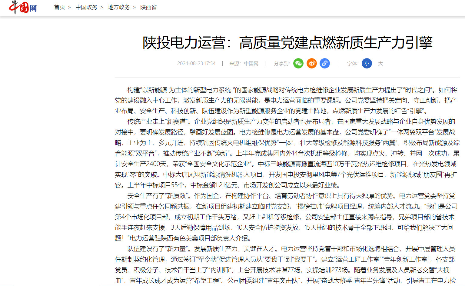 傳統(tǒng)產(chǎn)業(yè)走上“新賽道”。企業(yè)黨組織是新質(zhì)生產(chǎn)力變革的啟動者也是布局者,在國家重大發(fā)展戰(zhàn)略與企業(yè)自身優(yōu)勢發(fā)展的對接中,要明確發(fā)展路徑,擘畫好發(fā)展藍(lán)圖。電力檢維修是電力運營發(fā)展的基本盤,公司黨委明確了“一體兩翼雙平臺”發(fā)展戰(zhàn)略,主業(yè)為主、多元并進(jìn),持續(xù)鞏固傳統(tǒng)火電機(jī)組維保優(yōu)勢“一體”,壯大等級檢修及能源科技服務(wù)“兩翼”,積極布局新能源及綜合能源“雙平臺”,推動傳統(tǒng)產(chǎn)業(yè)不斷“煥新”。上半年完成集團(tuán)內(nèi)外14臺次機(jī)組等級檢修,均實現(xiàn)點火、沖轉(zhuǎn)、并網(wǎng)一次成功,累計安全生產(chǎn)2400天,榮獲“全國安全文化示范企業(yè)”。中標(biāo)三峽能源青豫直流海西10萬千瓦光熱運維檢修項目,在光熱發(fā)電領(lǐng)域?qū)崿F(xiàn)“零”的突破。中標(biāo)大唐鳳翔新能源清洗機(jī)器人項目,開發(fā)國電投安徹里風(fēng)電等7個光伏運維項目,新能源領(lǐng)域“朋友圈”再擴(kuò)容。上半年中標(biāo)項目55個,中標(biāo)金額1.21億元,市場開發(fā)創(chuàng)公司成立以來最好業(yè)績。