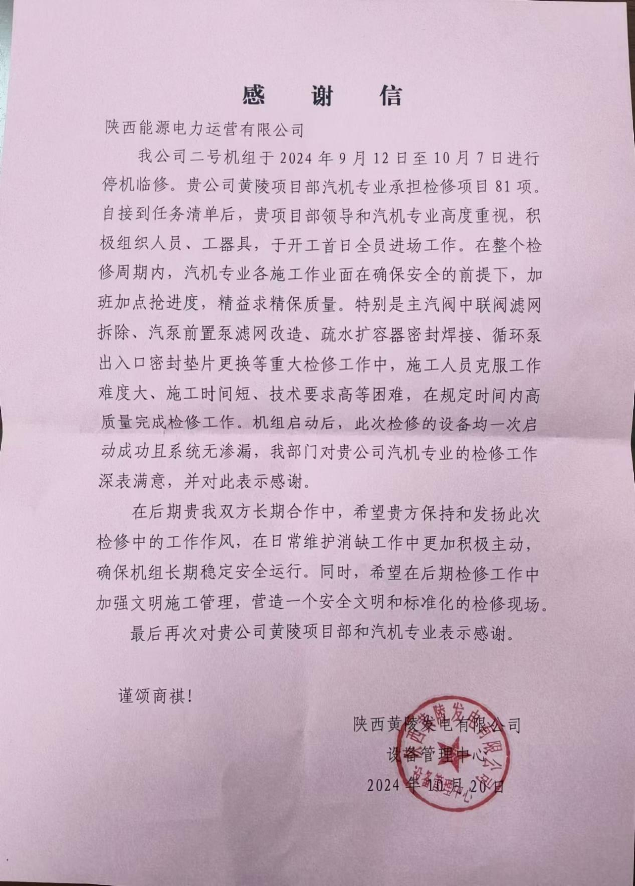 10月20日,黃陵項(xiàng)目部收到業(yè)主發(fā)來(lái)的感謝信,對(duì)項(xiàng)目部高質(zhì)量完成#2機(jī)組臨修工作給予高度認(rèn)可。