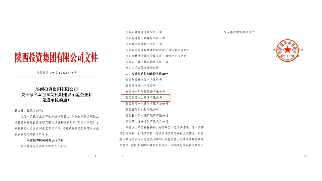 近日,公司榮獲陜投集團(tuán)“雙重預(yù)防機(jī)制建設(shè)先進(jìn)單位”稱(chēng)號(hào)。