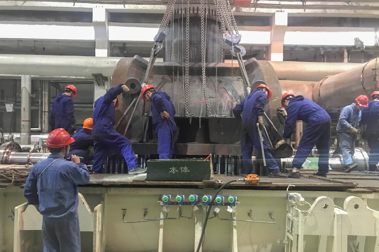 本次工作的重中之重是#6機高背壓轉(zhuǎn)子更換,直接關(guān)系到機組能否按期對外供熱,僅有13人的主機班承擔(dān)起了這項需要35人擔(dān)負(fù)的重任,他們組織精兵強將,加班加點,通宵奮戰(zhàn)在生產(chǎn)一線。在低壓缸的解體過程中,因為隔熱罩遮擋,電動工具不能正常使用,面對50多個M75×460的大型螺栓,班組全體人員紛紛上陣,用大錘一錘一錘敲、用扳手一根一根拆,最終只用了2天時間,為后續(xù)的工作贏得了寶貴時間。