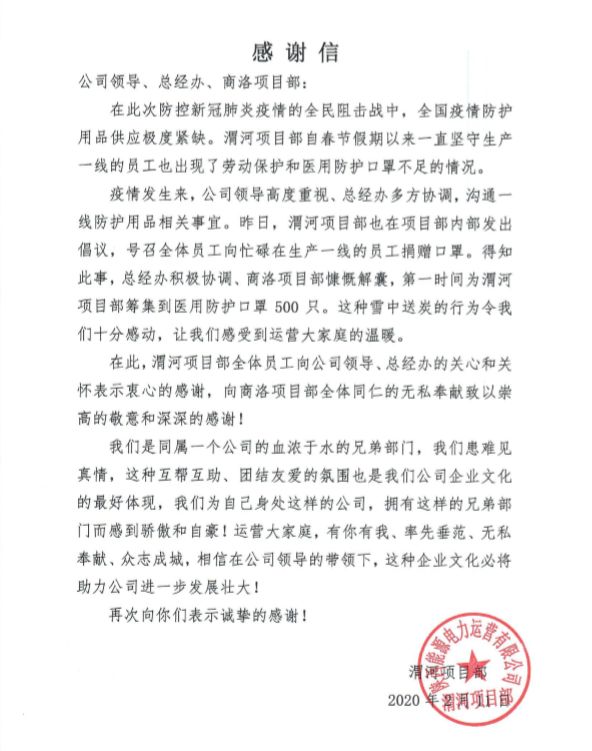 一方有難,八方支援,在渭河項目部疫情防控的最困難時期,作為甲方的渭電有限公司得知情況,立即伸出援手,為渭河項目部送來醫(yī)用口罩316只。渭電公司副總經(jīng)理黃衛(wèi)東說:“渭河項目部與渭電公司本是一家,只因改革成為兄弟單位。我們同居一處,同保生產(chǎn),共同抗疫,肩負著共同的責(zé)任和使命。”