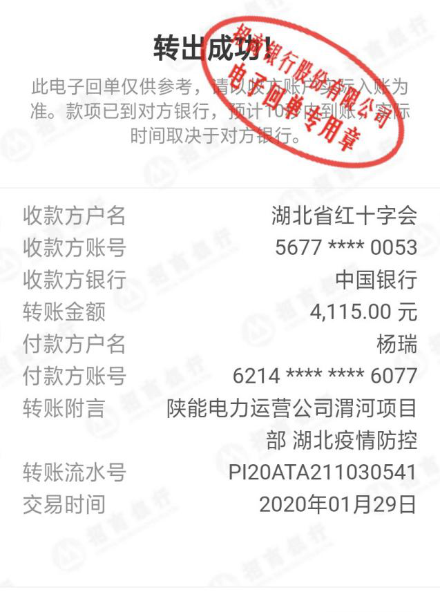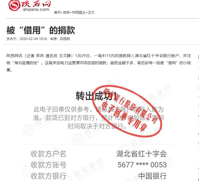 1月29日,一筆4115元的捐款轉(zhuǎn)入湖北省紅十字會(huì)銀行賬戶,并注明“湖北疫情防控”。這筆來自電力運(yùn)營渭河項(xiàng)目部的捐款,雖然金額不多,背后卻有一段被“借用”的小故事。