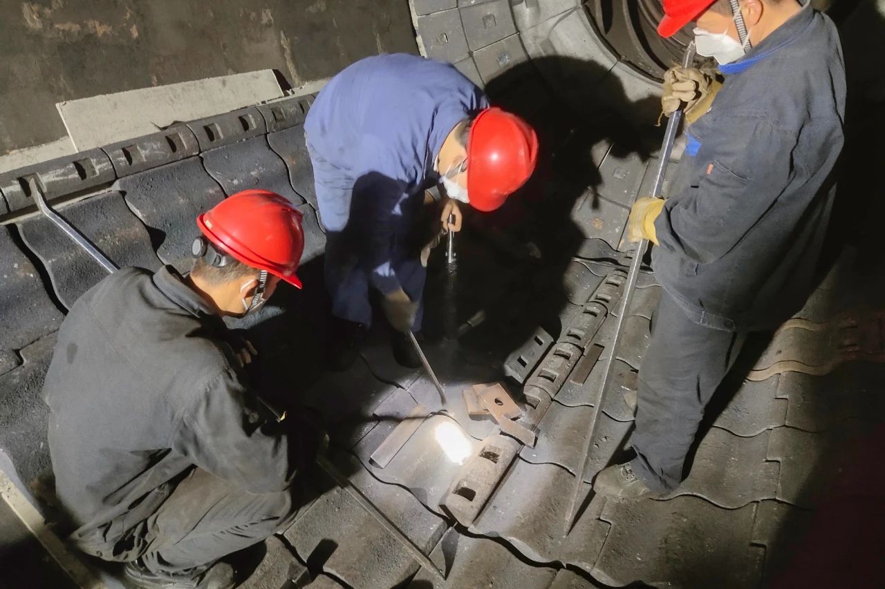 鍋爐工作現場,制粉班正在磨煤機鋼甲的安裝工作。工作人員先將每塊重達60多公斤的鋼甲按單雙型號擺放在石棉板上,再用撬杠調整水平度與垂直度,然后敲擊大錘擰緊楔鐵、操作氣動扳手鎖緊螺母。整個過程需要檢修人員緊密配合,使單雙型號鋼甲咬合于楔鐵上,不能有絲毫誤差。就在這樣的工序下,制粉班的一群壯漢們以“繡花”功夫,完成了384塊罐體鋼甲和64塊端部鋼甲的安裝工作。