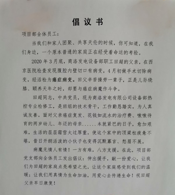 近日,商洛發(fā)電設(shè)備部職工田超的父親因患癌癥入院治療。聞知消息后,立即向全體職工發(fā)出捐款倡議,大家伸出援助之手,紛紛慷慨解囊,積極踴躍捐款,以實際行動表達(dá)電力運營對兄弟單位員工的關(guān)愛。