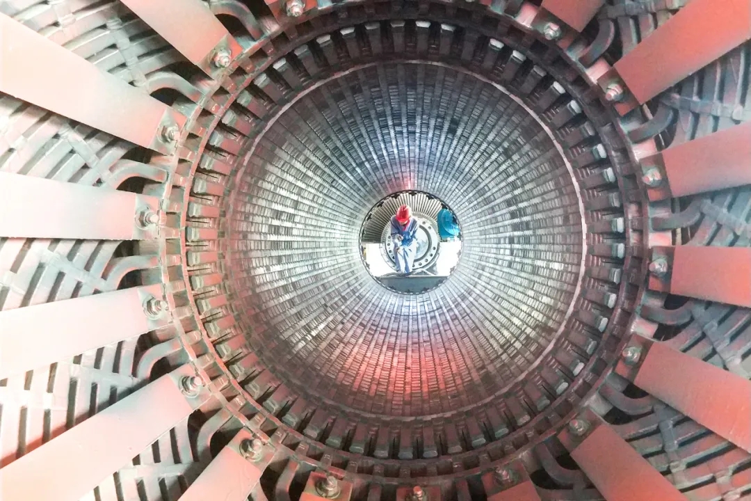 檢修現(xiàn)場,在起重人員的指揮下,在兩臺行車的配合下,轉子一寸一寸緩緩向外移動。此刻,從A級檢修開始以來,24小時堅守現(xiàn)場的機務隊主機班人員正全神貫注,或守在轉子兩側精心維護、或鉆入發(fā)電機內認真觀察動靜間隙,每一項工作都一絲不茍。
