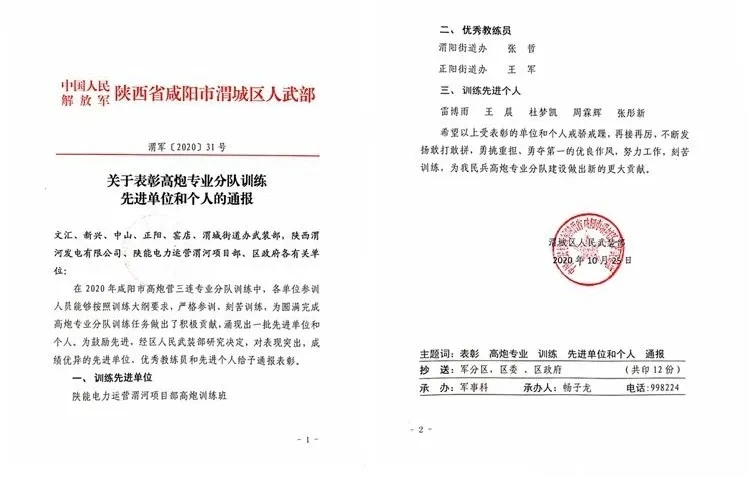 10月25日,在結(jié)訓(xùn)總結(jié)表彰大會(huì)上,國(guó)防動(dòng)員單位領(lǐng)導(dǎo)對(duì)渭河項(xiàng)目部參訓(xùn)人員的表現(xiàn)給予充分肯定,對(duì)他們雷厲風(fēng)行的作風(fēng)和頑強(qiáng)拼搏的精神給予高度贊揚(yáng)。“陜能電力運(yùn)營(yíng)渭河項(xiàng)目部高炮訓(xùn)練班”被咸陽(yáng)市渭城區(qū)人民武裝部評(píng)為“年度訓(xùn)練先進(jìn)單位”,張彤新同志被評(píng)為“年度訓(xùn)練先進(jìn)個(gè)人”,并予以通報(bào)表彰,為公司贏得了榮譽(yù)。