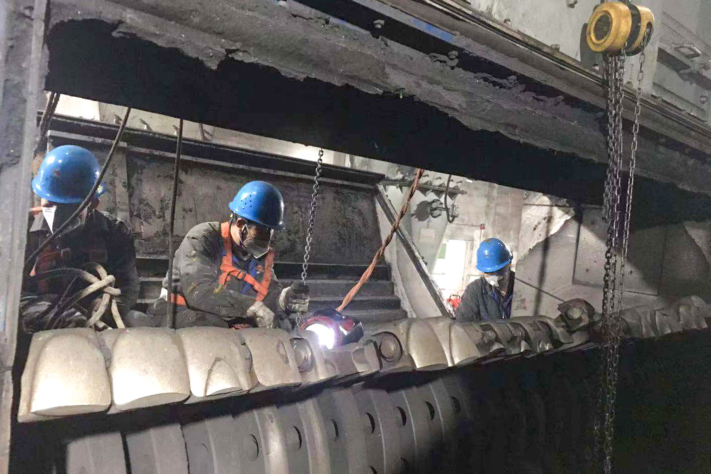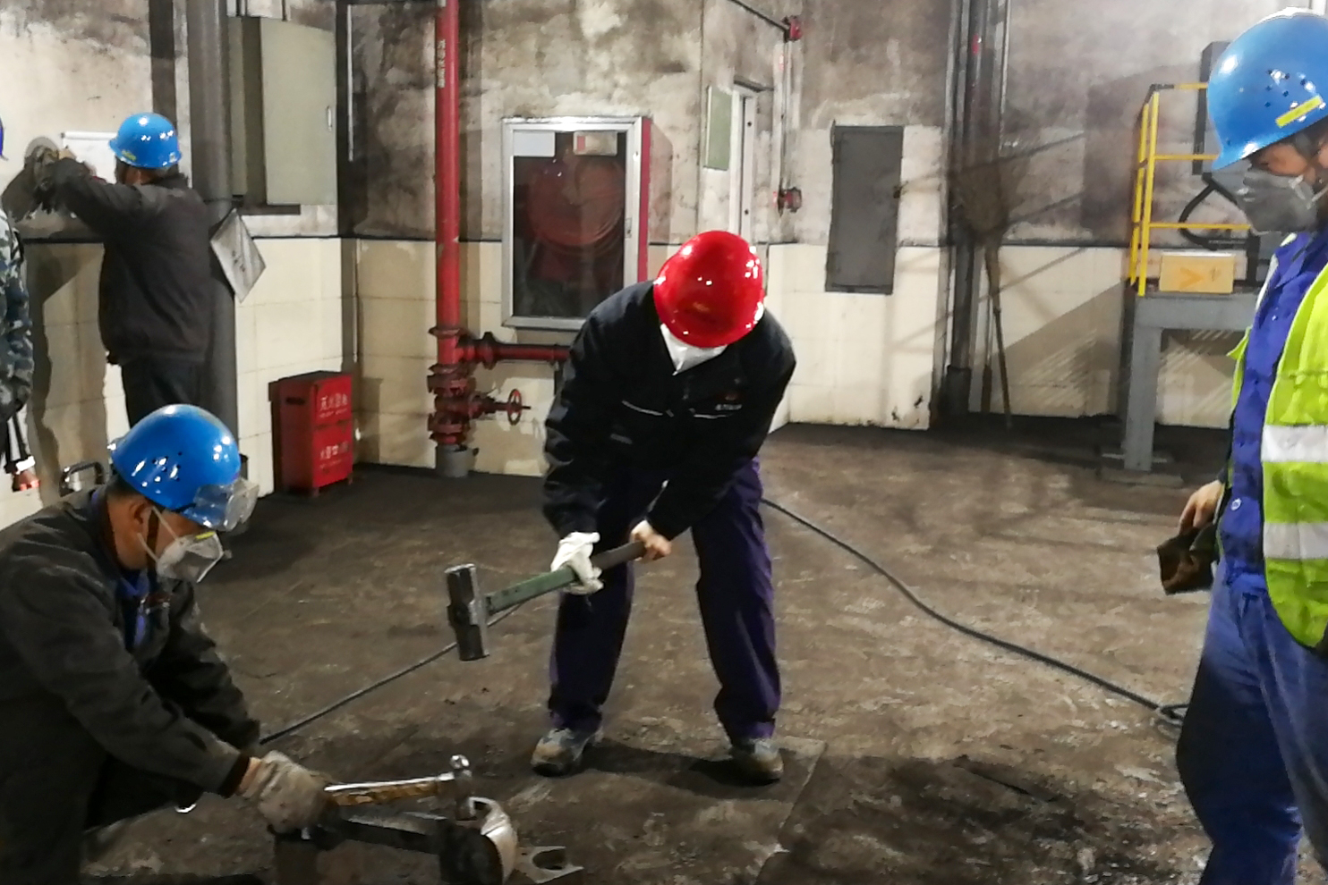 方案一經(jīng)確定,搶修戰(zhàn)役隨即打響。全體參戰(zhàn)人員多路分兵,稱(chēng)重配錘、打磨軸銷(xiāo)、拆除損壞錘臂錘頭,全力投入搶修工作。配對(duì)組在配重過(guò)程中,為了確保一次配重成功,補(bǔ)焊人員精益求精,將誤差控制在0.01kg內(nèi);拆卸組在環(huán)軸與錘臂夾死的處理中,絲毫沒(méi)有因?yàn)椴鹦独щy而有一絲松懈,大家集思廣益,商討制作各種工器具、反復(fù)嘗試各種拆卸方法。最終,在連續(xù)奮戰(zhàn)48小時(shí)后,搶修任務(wù)順利完成,試轉(zhuǎn)一次成功。看著“滿血復(fù)活”的設(shè)備重新投入使用,全體參戰(zhàn)人員的臉上露出了會(huì)心的微笑。