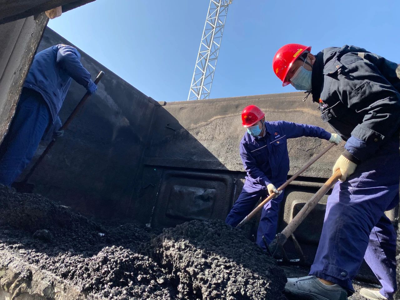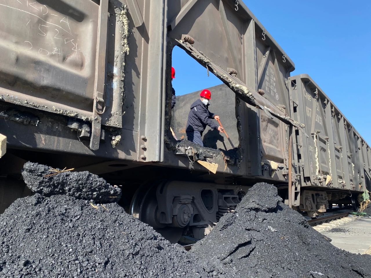 1月12日,商洛項目部從管理干部中緊急抽調(diào)18名人員奔赴煤場,對“凍煤”展開人工清理。清理凍煤是一項費勁的體力活,更是一項費時的細(xì)活。車廂內(nèi),工作人員有序分工,揮動鐵鎬和鐵鍬,清理著車廂底部、拐角等處的凍煤。厚厚的凍煤堅硬如鐵,工作人員掄圓胳膊,使勁揮動鎬頭卻只“啃”下很小的一塊。一鎬鎬挖,一塊塊敲,一點點清,清理完一節(jié)車廂,汗水早已濕透了棉服,卻沒有一個人停下手上的活,又馬不停蹄轉(zhuǎn)戰(zhàn)另一節(jié)車廂。